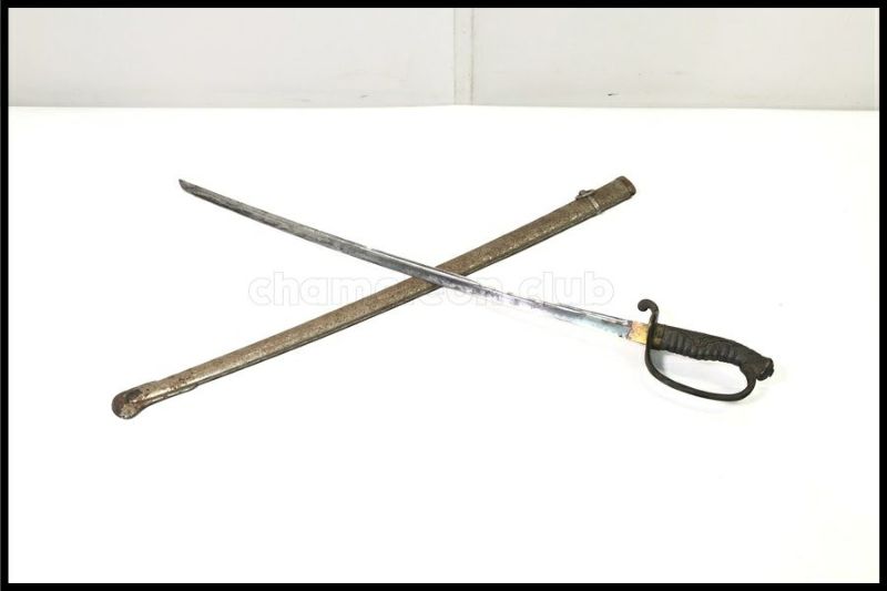 - 中古:D(強い使用感あり/目立つキズ、ヨゴレ、サビなど)鞘あり。刀身に保管、経年に伴うスレ、小傷、くすみ、目立つサビがあります。刀身の一部に切り欠きがあります(破損?)。刀身の一部に刃こぼれの様な傷があります。鞘など全体的に汚れ、サビ、柄の一部に破損が見られます。駐爪は機能します。全体的に傷みが目立ちます。中古、現状品となりますので、画像にて内容、状態をご確認の上ご検討ください。