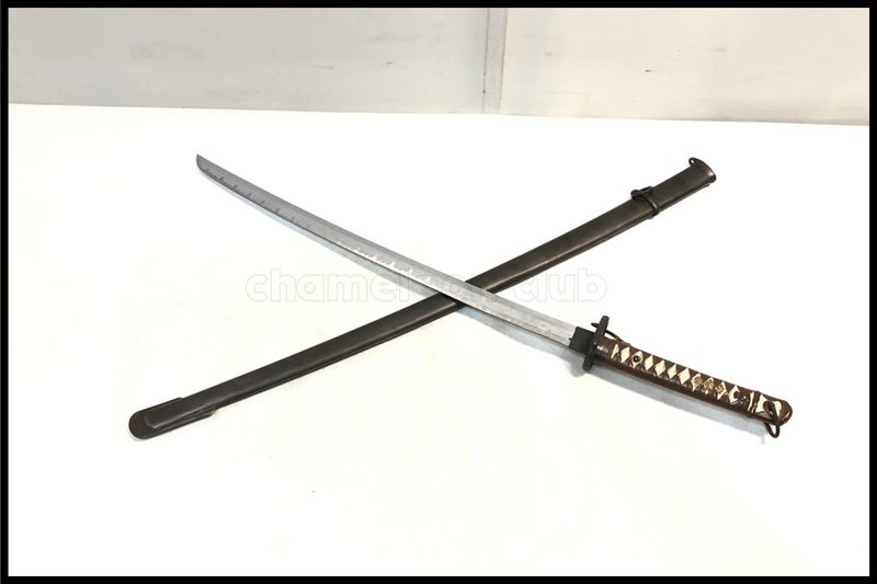 - 中古:C(使用感あり/キズ、ヨゴレあり)刀身は刃の無い模造刀です。重量890g(鞘を払って) 鞘重量500g程度(鉄製)全長80cm ブレード長58.5cm程度です。鞘の口にナンバリングと鍔の部分に刻印が見られます。経年によるダメージと擦れキズ等が見られます。現状品となりますのでよくご確認ください。