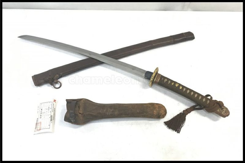 - 中古:C(使用感あり/キズ、ヨゴレあり)保管、経年に伴うスレ、くすみ、サビなどがありますが、目立った刃こぼれは見られません。駐爪が付いていますが、内部で干渉してしまっている為はテンションが掛からず(ボタン部分を押し込めない※内部のバネは生きています)鞘に納めた際に引っかかりません。刀身自体が勝手に抜けてしまう事はありません。鞘、柄側にも革製のカバーが付属していますが、こちらも経年に伴うスレ、汚れなどがあり、一部剥がれや破れてしまっている箇所も見られます。他写真に写りきらない細微な傷や汚れがある場合がありますので予めご了承ください。中古、現状品となりますので、画像にて内容、状態をご確認の上ご検討ください。