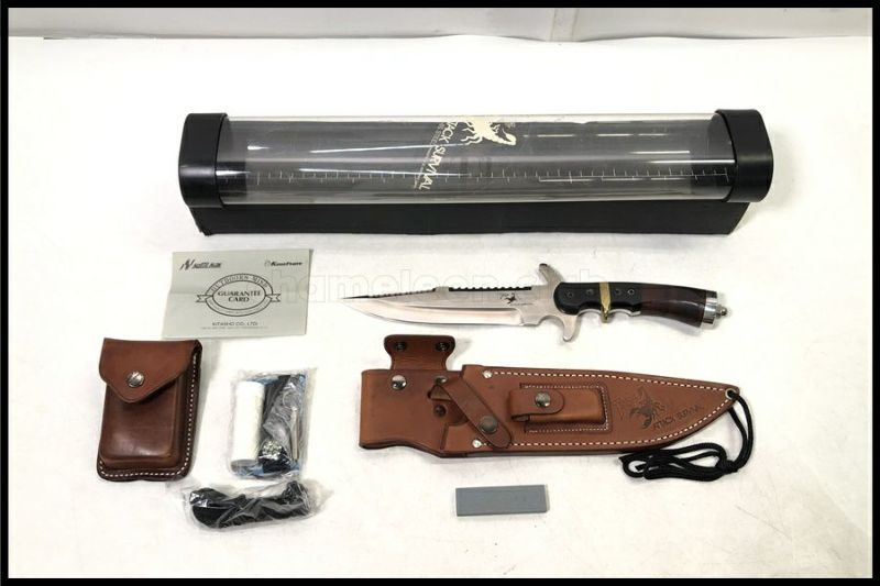 - 中古:B(使用感少な目/小キズ、ヨゴレ少々)箱(傷み)、ケース、シース付き。シースの金属ボタンにサビがあります。刀身に若干のくすみがありますが、目立った傷、刃こぼれなどは見られません。中古品となりますので、画像にて内容、状態をご確認の上ご検討ください。