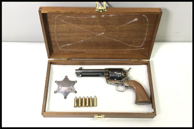 - 中古:E(ジャンク/要メンテナンス、オーバーホール推奨。現状お渡し品)木箱、カートリッジ、シェリフバッジ付属。木箱内赤ラシャ、説明書欠品。本体は若干の擦り傷等ございますが、使用感は少なめです。過去の発火状況は不明ですが、カートリッジ内部はきれいな状態で、シリンダー内部にサビが見受けられますが、経年劣化と思われます。グリップは木製です。重量:約720g (カートリッジ含まず) ハンマーを起こすとシリンダーは回りますが、~トリガーを引いてもハンマーが落ちません。トリガーを引きながらハンマーを押すと前に戻ります。ジャンク品となり現状品でのお渡しとなりますので、内容や状態をよくご確認の上ご検討ください。